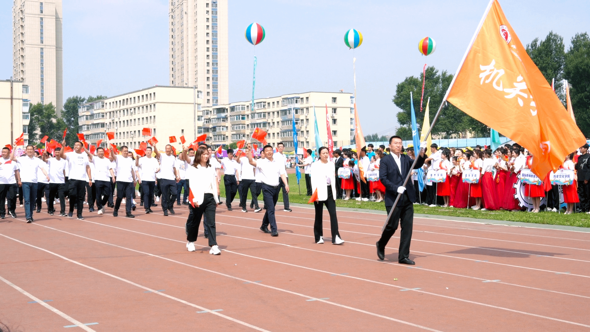 在庄严雄壮的国歌声中,五星红旗在田径场冉冉升起。