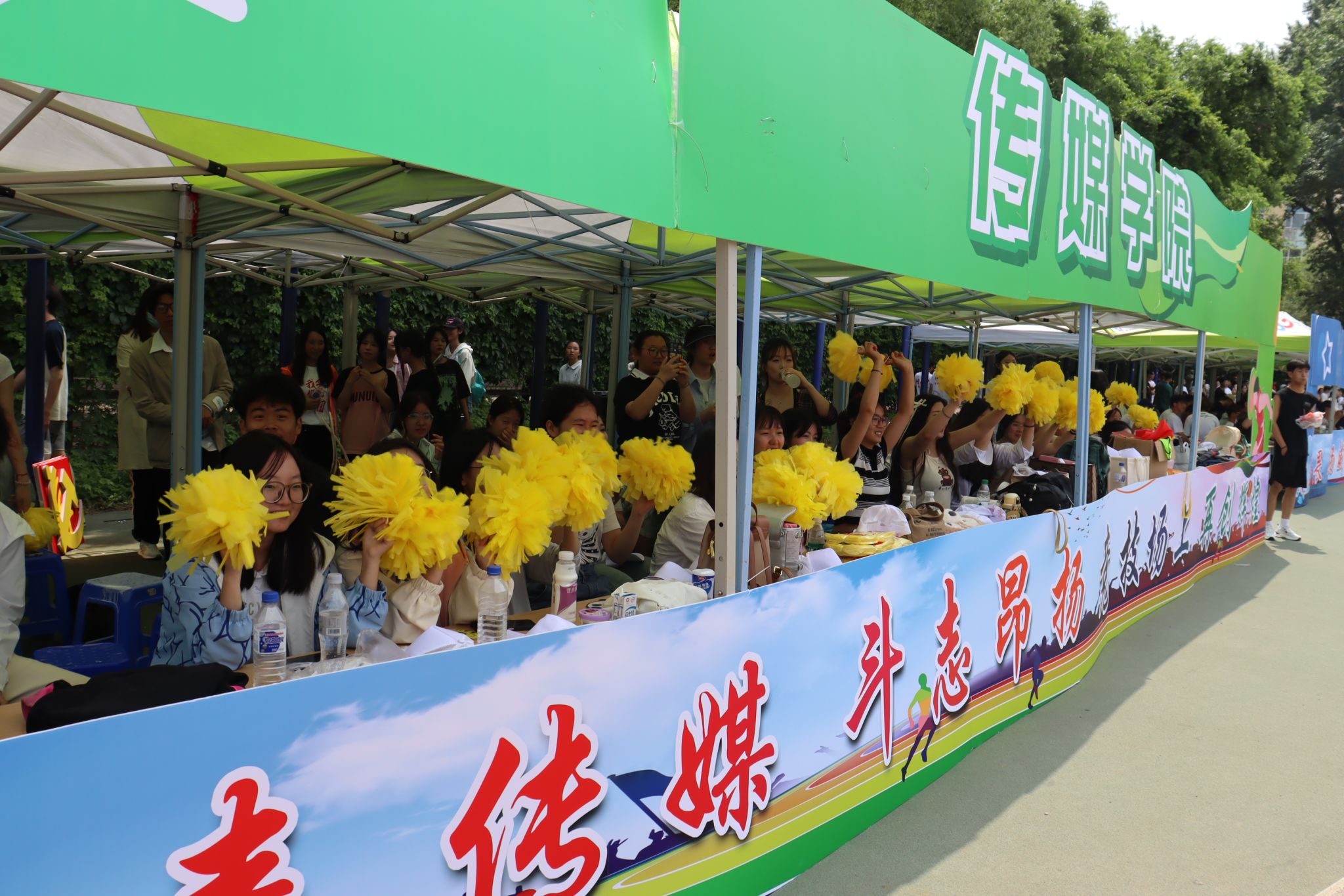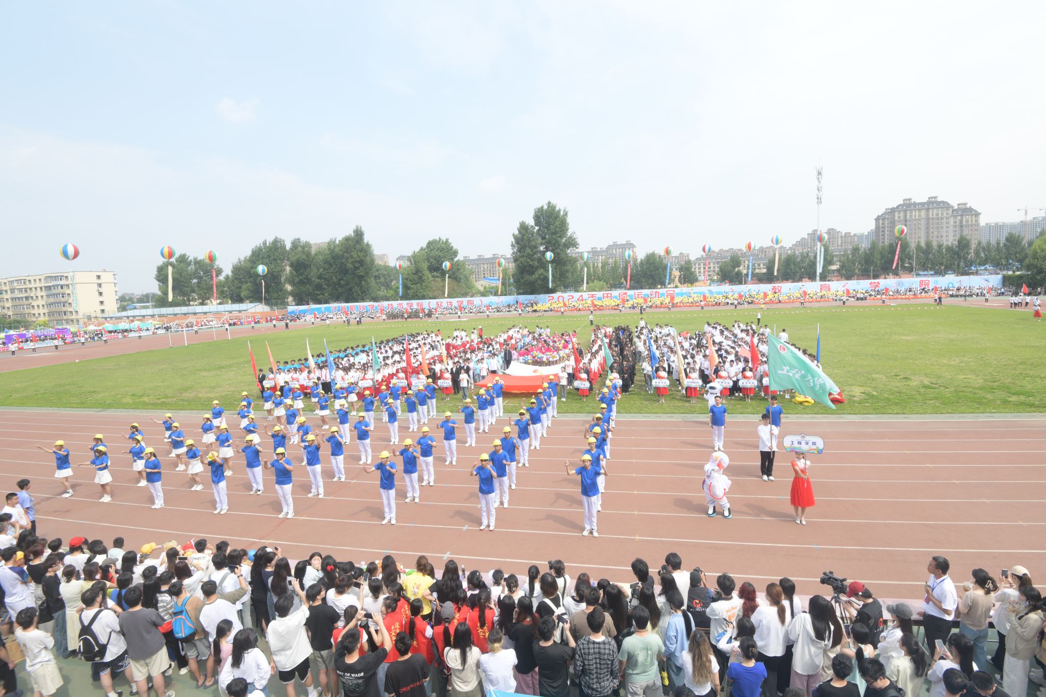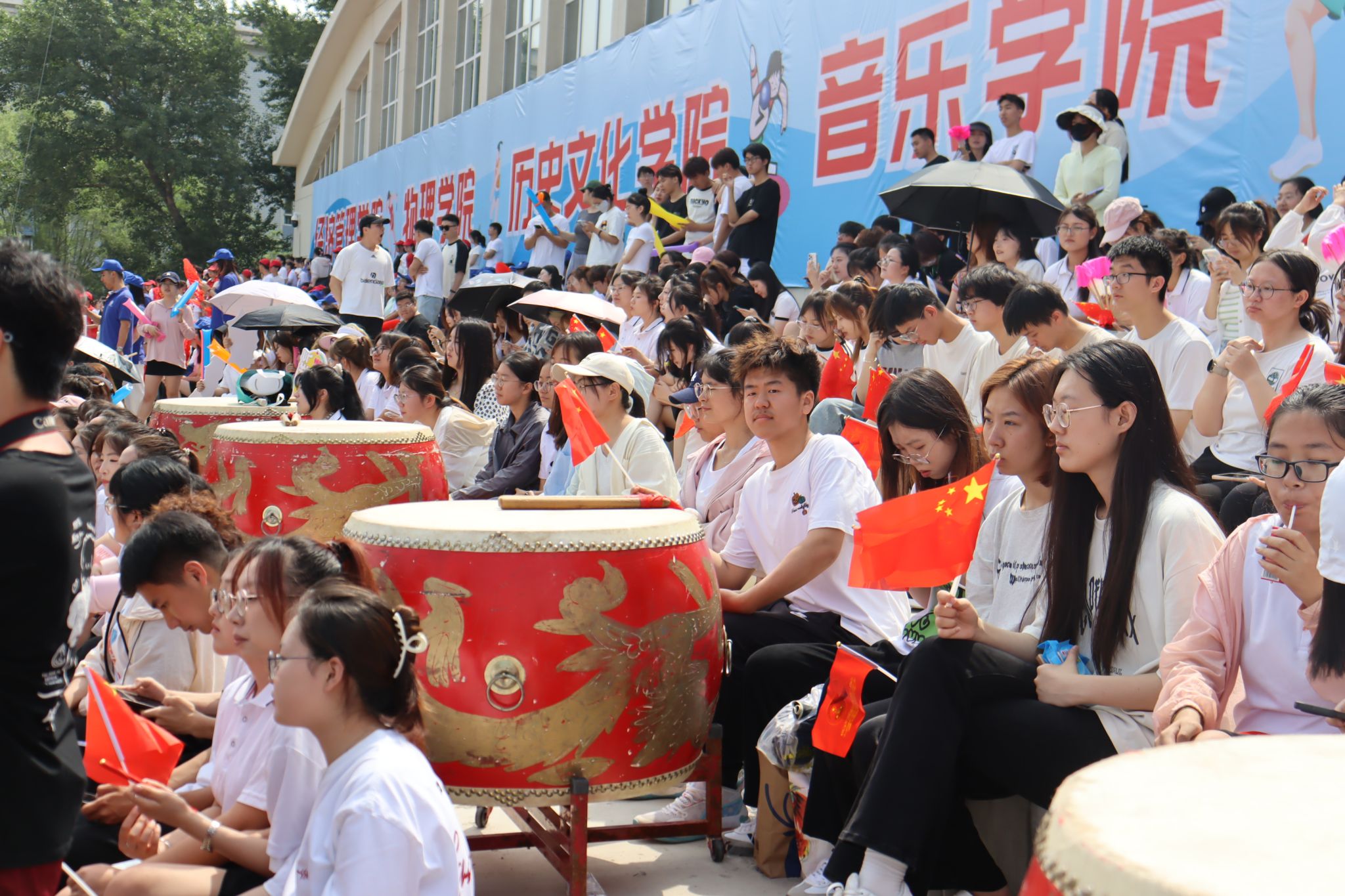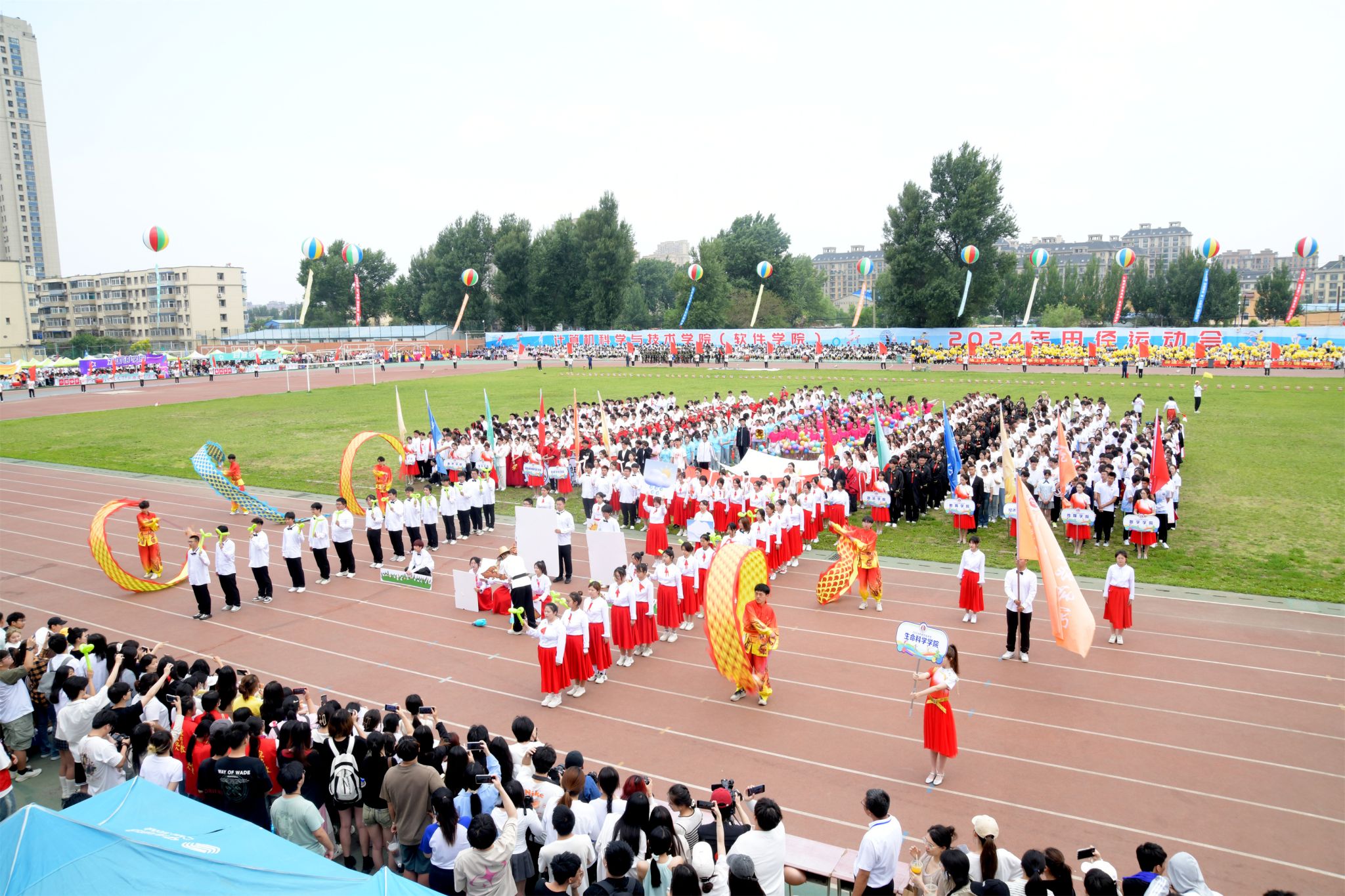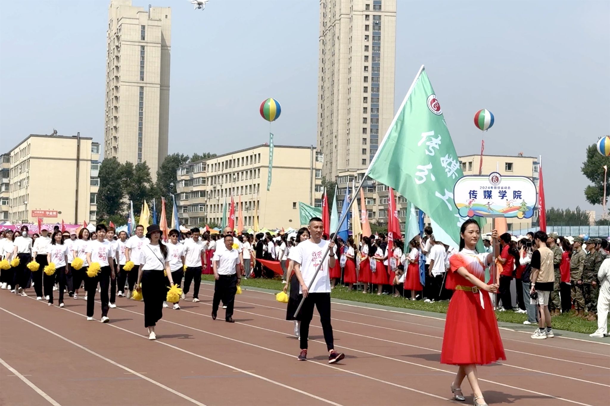 观众席上,旗帜挥舞,热情高涨的同学们为运动员的精彩表现欢呼喝彩,仿佛他们也是赛场的一部分。当运动员冲过终点或跃过横杆,爆发出热烈的掌声和欢呼为运动员的拼搏点赞。绿茵场中,律动优美的百人舞翩翩起舞,随着音乐节奏将每一个舞蹈动作做到与律动节拍完美融合,表达了长师学子对祖国的美好祝福及对未来的欣然向往。