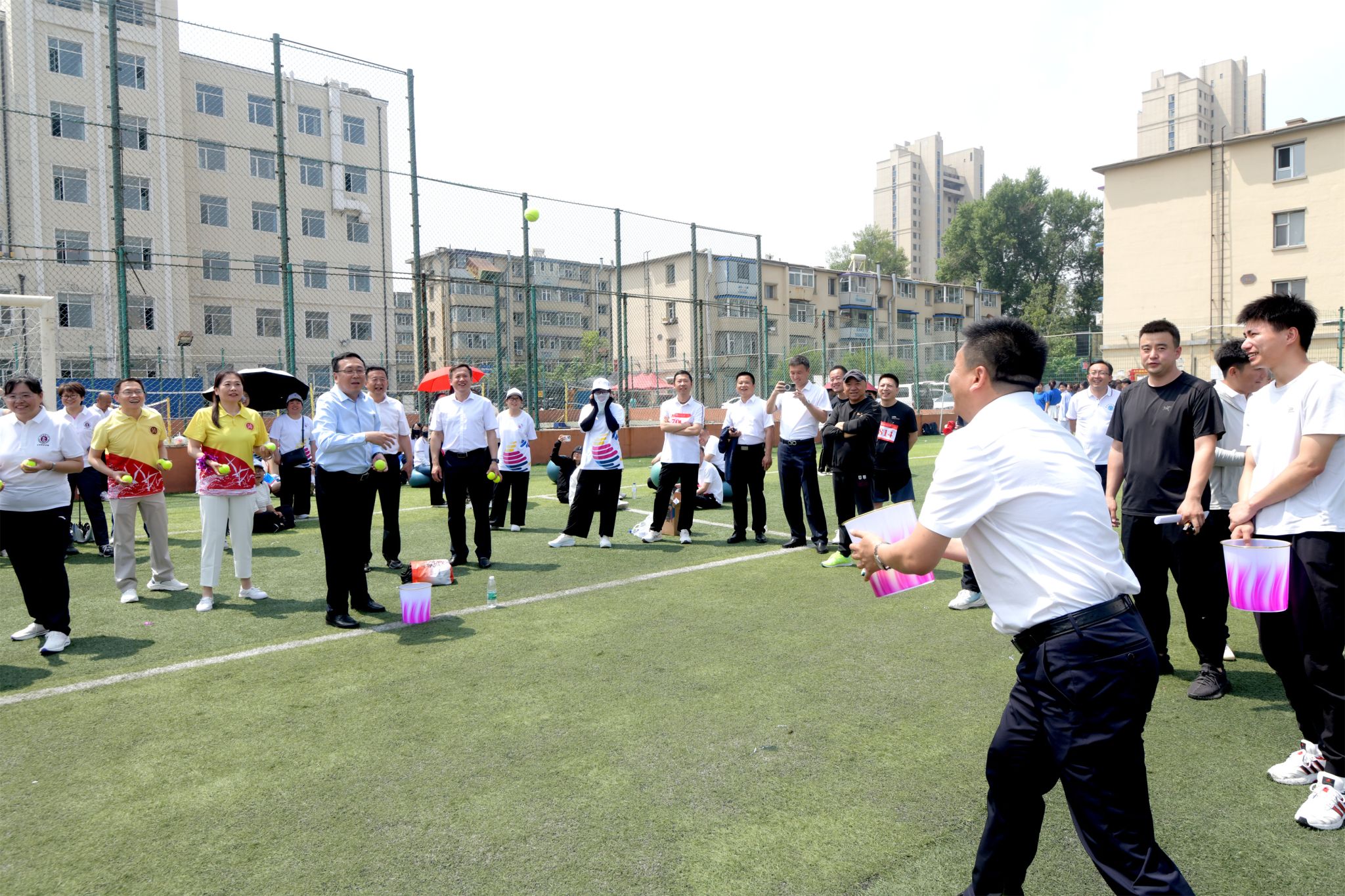 享快乐运动,做阳光教师。毛毛虫竞速、前呼后拥、同心鼓等别出心裁的教职工趣味运动项目火热进行。他们工作时全力以赴,游戏时热情奔放,比赛现场掌声、笑声、喝彩声此起彼伏,精彩纷呈。