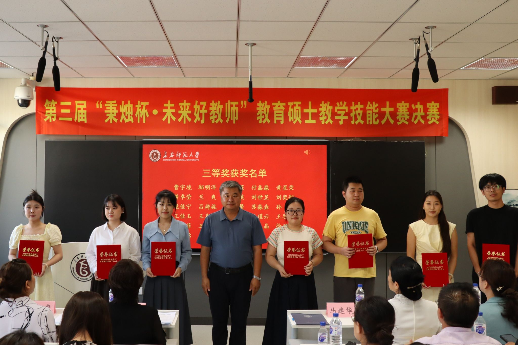 7月3日,由研究生院主办,各教育硕士培养单位协办的第三届“秉烛杯·未来好教师”教育硕士教学技能大赛决赛在我校举行。副校长陈爱梅出席颁奖仪式并讲话。长春市养正高级中学校长杨凤桐、长春外国语学校副校长娄爽、长春职业技术学校副校长李曼、东北师范大学华蕴实验学校副校长刘仙玲等专家代表,评委团专家,各学院代表、指导教师代表和研究生院全体人员共160余人到场观摩。